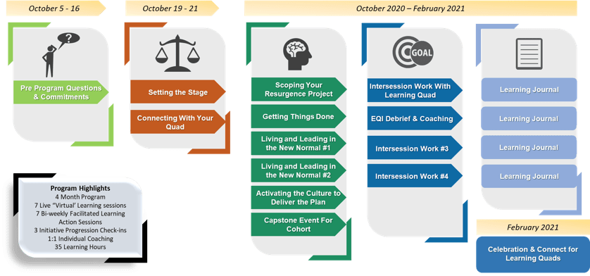 This four-month, virtual program which begins October 19th will surround your leader with a counsel of experts, a community of peers, a personal coach and immediate practical tools and insights to deliver results. To support the project delivery, the program also includes a focus on personal resilience, leveraging the most powerful emotional intelligence assessment, debriefed and supported by a certified expert coach.