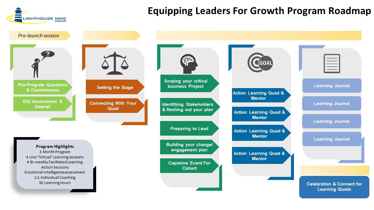 Each participant’s journey and project will be supported by Lighthouse NINE Group’s expert faculty and 1:1 mentors/certified coaches. Prior to beginning the program, each participant will complete an EQi (Emotional Intelligence Assessment) and will participate in a debrief/coaching session around becoming a Safe Brave Leader. Each session will develop a participant’s core leadership competency: