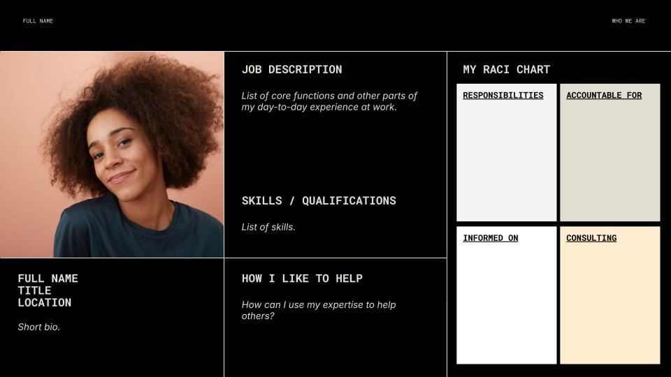 We’ve developed a Google Slide template you can copy to help you define everyone’s roles and share the exercise results. You can duplicate the Google slide to have one for each team member. Once you have created these, take a quick ‘pulse-check’ with team members to ensure they align with your discussion and their jobs.